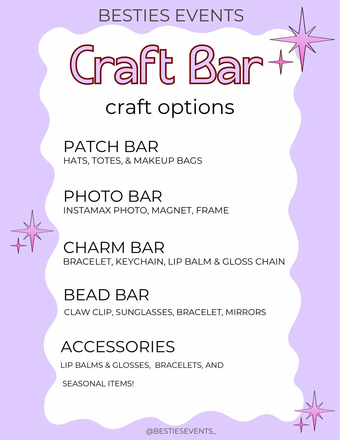 - credit for one craft from craft bar with @bestiesevents_ ( see above photo for reference or flyers on social media)